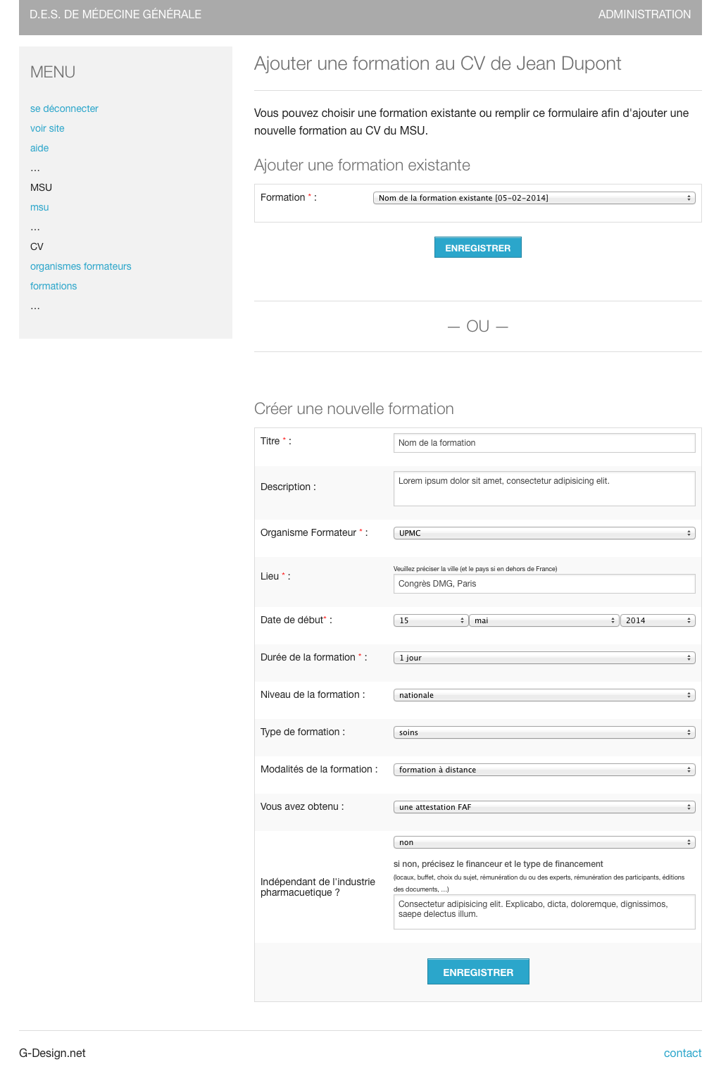 Le formulaire est presque identique au formulaire utilisé par les MSU. Un administrateur général peut créer une formations nationale ou facultaire et un administrateur UFR peut créer une formation facultaire.