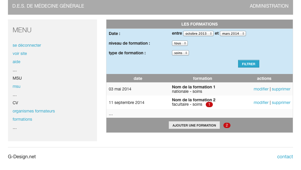 Après avoir cliqué sur le bouton "formations", une nouvelle page s'affiche avec la liste détaillée de toutes les formations d'un MSU.
