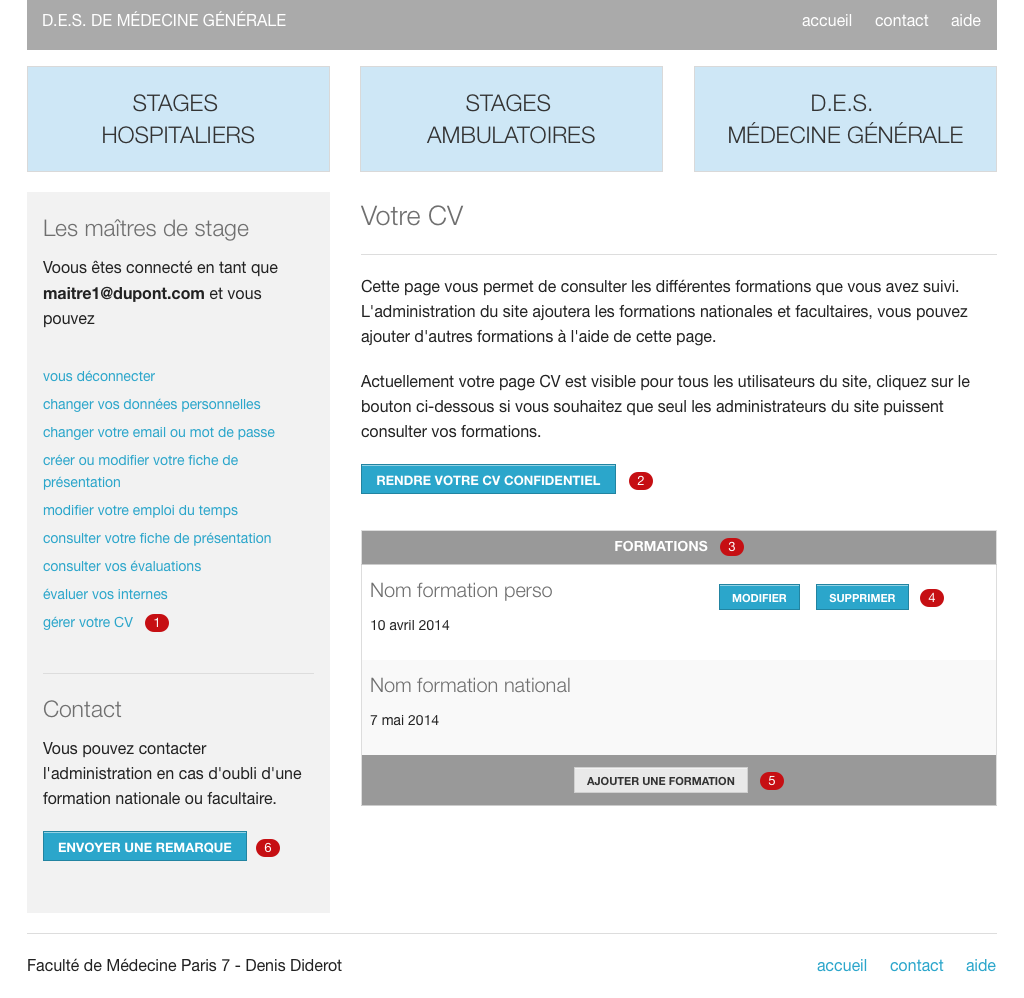 Un MSU peut modifier ou supprimer les éléments de son CV qu'il a ajouté lui-même. (4) Seul les administrateurs peuvent ajouter des formations nationales et facultaires. Le MSU peut ajouter les autres formations (5) et envoyer une remarque à l'administration en cas d'oubli d'une formation nationale ou facultaire. (6)